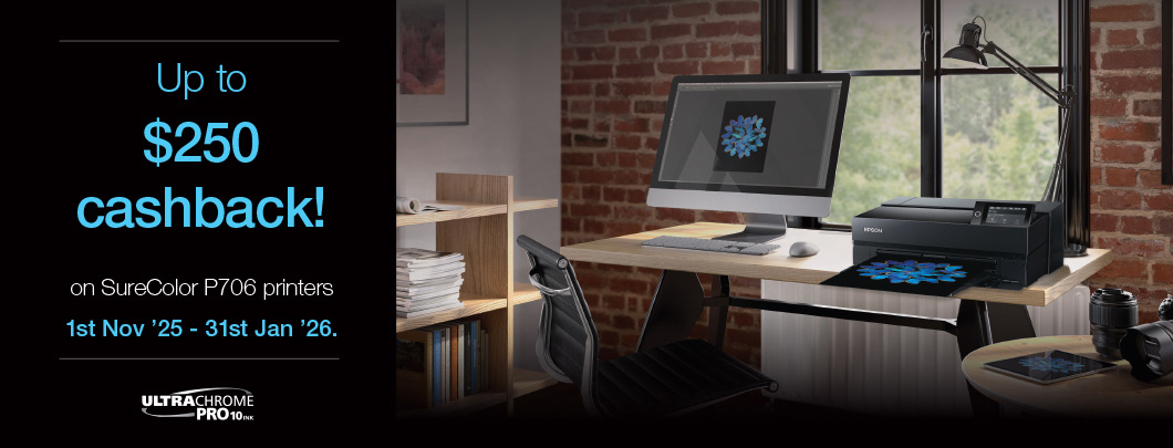 Purchase a new Epson SureColor P706 printer or printer and CoverPlus bundle from FULL GAMUT between 1 November 2025 and 31 January 2026 and claim the following cashback.