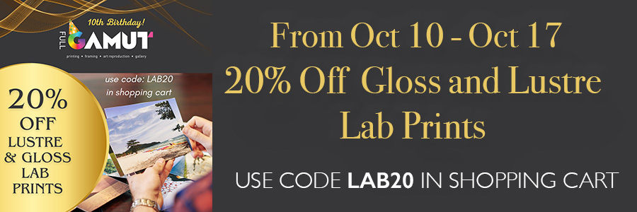 Our standard print surfaces are lustre and gloss. Traditional and 35mm photo sizes are available as well as panoramas up to 12x48” (30.5x122cm). Prints can be exact size*, borderless or have a small 3mm border. Borderless prints will auto expand by about 3% so image details near the edge of the frame will be trimmed off. Please allow for this in your cropping.